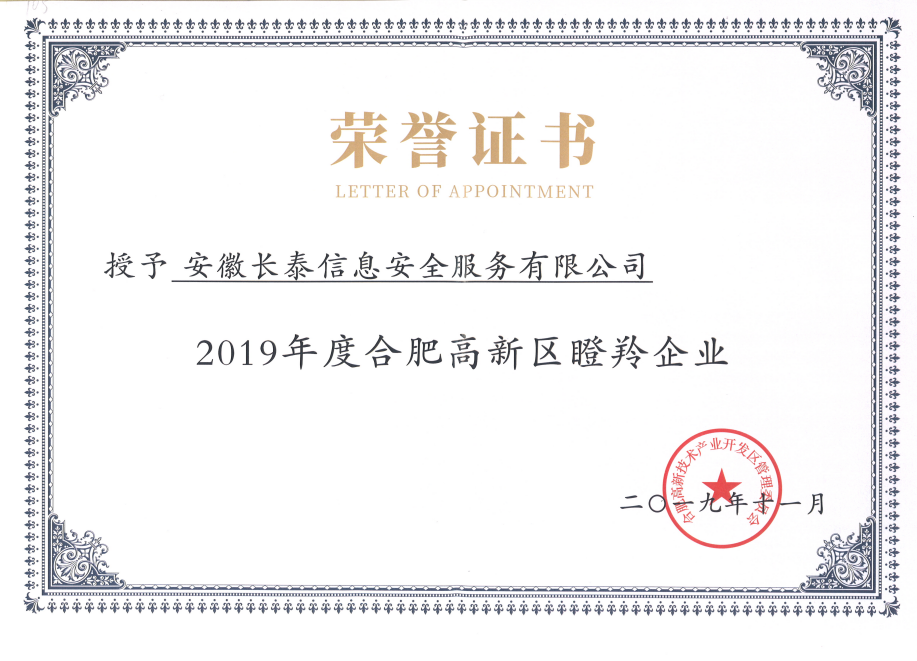 2019年,11月20日,合肥高新区2019年高成长企业榜单正式发布,高新区共认定了502家高成长企业,其中雏鹰企业275家、瞪羚培育企业72家、瞪羚企业149家、潜在独角兽企业3家、独角兽企业1家、平台型龙头企业2家。作为其中的高科技企业——安徽必威网页版-必威(中国)-必威(中国)成功入选瞪羚企业榜单。